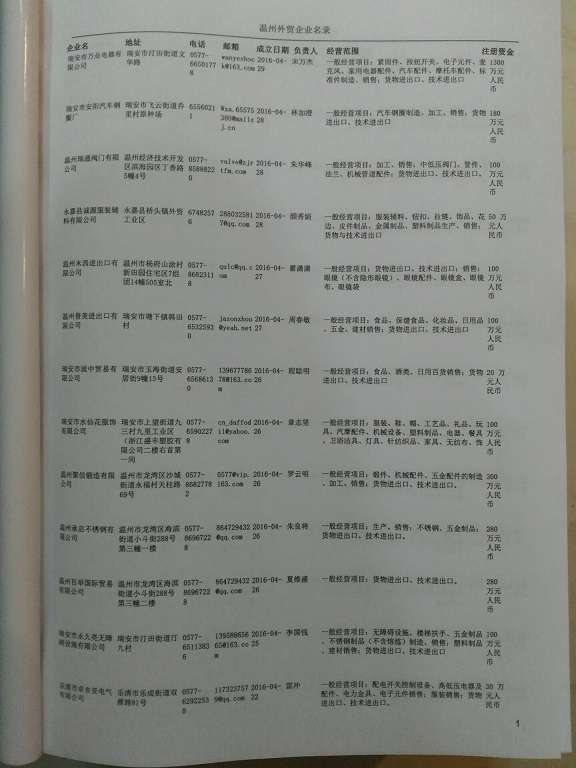 2021版最新溫州企業黃頁包括《溫州制造企業黃頁》、《溫州貿易企業黃頁》、《溫州民營企業黃頁》、《溫州外資企業黃頁》、《溫州外貿企業黃頁》共五冊,現優惠價:280元/冊。每冊內容包括:單位名稱、地址、郵編、電話、傳真、郵箱、經營范圍等;溫州企業黃頁涵蓋了近幾年來最新成立的、有一定規模的企業,具有非常高的營銷價值。有了這套黃頁開展業務也有了針對性,也省去了盲目去尋找客戶名單而浪費的時間了,工作效率也會有很大的提高。歡迎需要溫州企業黃頁的朋友及時聯系我們!
